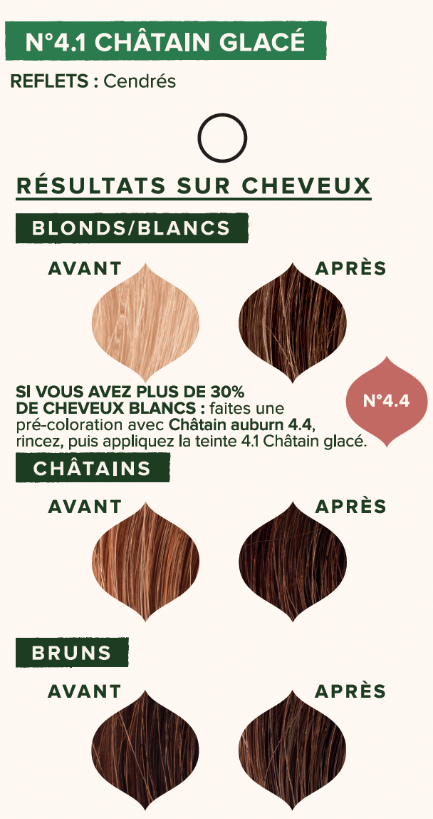 - sur cheveux châtains : cette teinte n'éclaircit pas, Châtain clair aux reflets cendrés sur cheveux châtain clair.