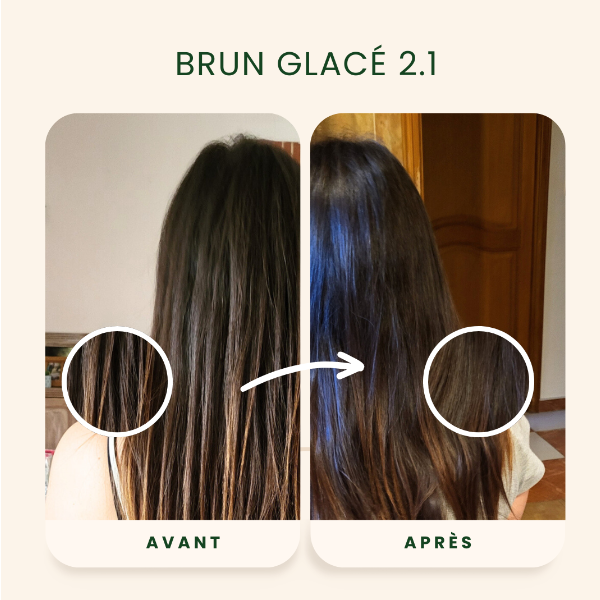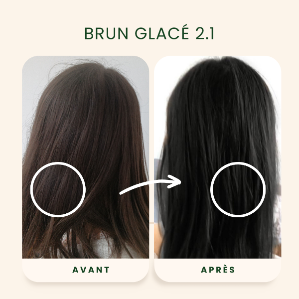 🌸 Si vous avez plus de 30% de cheveux blonds/blanc, faites une pré-coloration avec “Châtain clair ambré 5.3” ou “Châtain auburn 4.4”, rincez puis appliquez la teinte “Brun Glacé 2.1”.