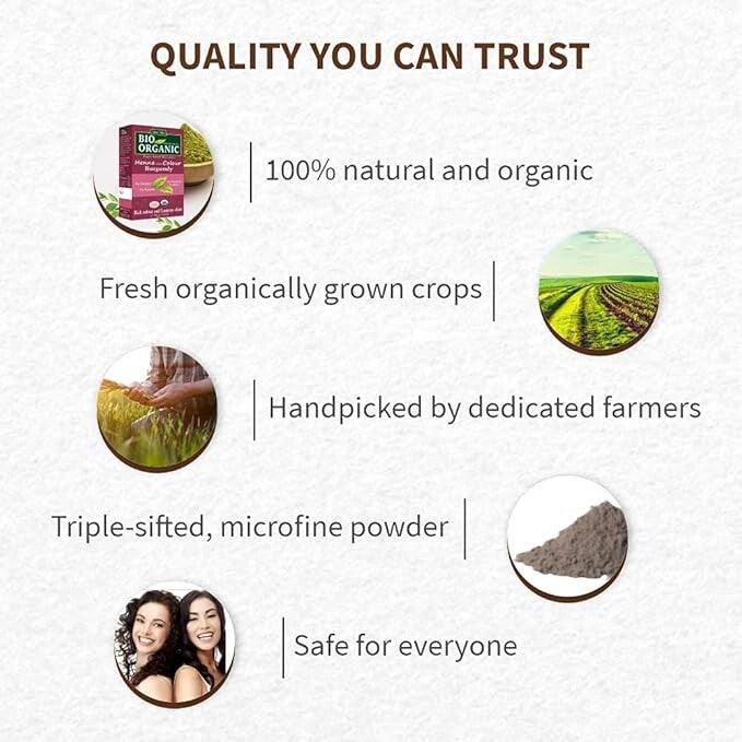 🍃Les Herbes utilisées dans les colorations sont cultivées dans l'environnement propre et non pollué de la vallée de l'Indus - c'est un avantage par rapport aux autres teintures non certifiées à base d'herbes et de henné, qui peuvent contenir des métaux lourds et des pesticides.