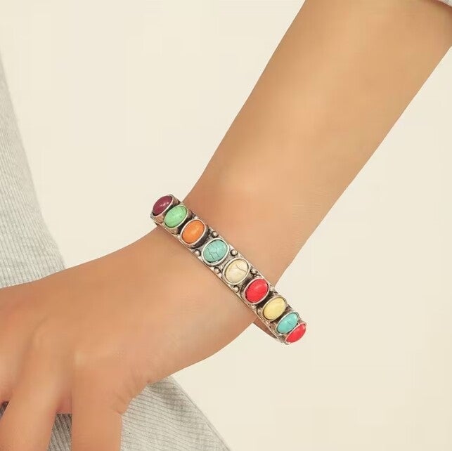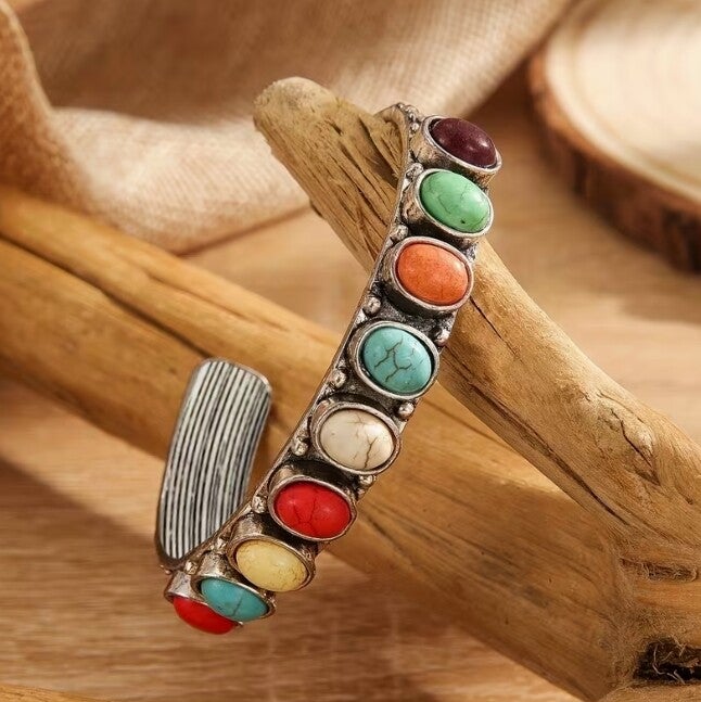 Les incrustations turquoise illuminent le bijou d’une couleur vibrante et naturelle, rappelant la beauté des pierres précieuses. Le plaqué argent apporte une finition élégante et brillante, rehaussant le charme artisanal du bracelet. Sa structure en alliage de zinc le rend à la fois léger et confortable, idéal pour un port quotidien ou lors d’occasions spéciales.