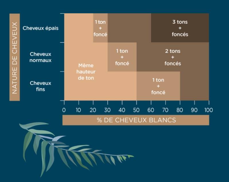 Plus vos cheveux blancs sont nombreux ou vos cheveux épais, plus il est conseillé de choisir une teinte légèrement plus foncée.