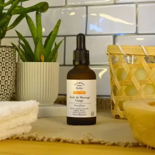 L’huile de massage visage de la marque Comptoir des Huiles est une synergie d’huiles végétales et essentielles sélectionnées pour leurs propriétés purifiantes et apaisantes.