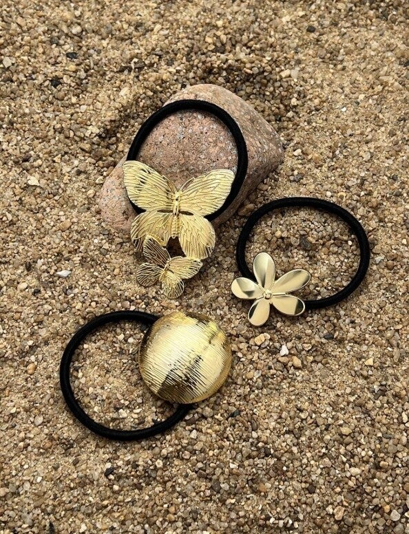 Sublimez vos coiffures du quotidien ou de soirée avec ce lot de 3 élastiques cheveux luxe, décorés de délicats ornements dorés : papillon, perle et fleur.
